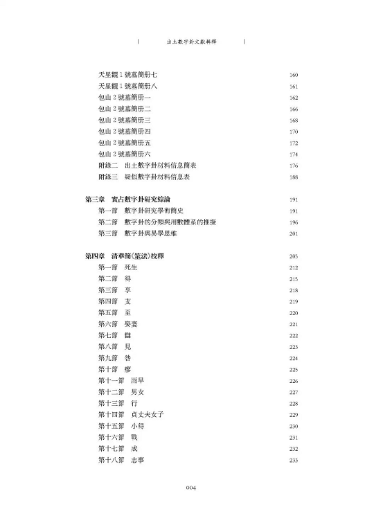 自通過博士學(xué)位論文答辯以來的六年間,又有一批優(yōu)秀的學(xué)者關(guān)心數(shù)字卦的問題,尤其是在清華簡《筮法》公布之后,涌現(xiàn)了諸多杰出的成果。在繹讀這些成果的過程中,我既體會到新的出土文獻(xiàn)資料對相關(guān)問題的巨大推動,亦感慨這篇舊作已難以超越時賢的最新研究,因而決定將其盡量以原始面貌呈現(xiàn)給讀者。需要說明的是,原學(xué)位論文并未收入知網(wǎng),后來有師友想了解情況,我曾將電子版全文呈給一些同好,而后定稿已在學(xué)界流傳并被部分研究者引用。按清華大學(xué)博士學(xué)位論文的寫作要求,論文原為簡體,為使古文字方面的討論便于閱讀,現(xiàn)改作繁體。此次出版除了一些文字錯誤、引書版本的補充更正和表述修改等技術(shù)方面的修訂外,整體內(nèi)容和觀點大體如舊。惟為保證所輯錄數(shù)字卦材料全面、清晰、準(zhǔn)確,今將原論文材料輯錄的部分新列為一章,調(diào)整了輯錄的格式,補充了新見的高清資料,并將前期研究做的電子摹本重新修改擴(kuò)增了進(jìn)來。懇望大家能以“階段性”成果的目光對本書加以批評。