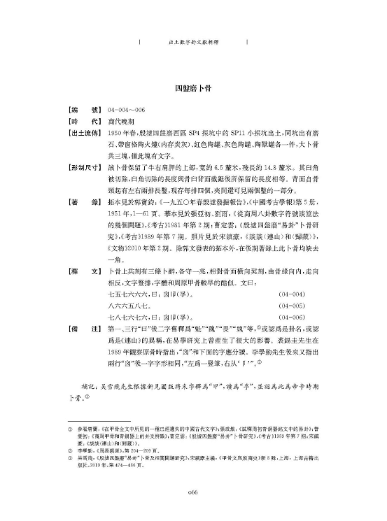 (孚)”,最近有幸讀到吳雪飛先生的《殷墟四盤磨“易卦”卜骨及相關(guān)問題研究》(《甲骨文與殷商史》新8輯,上海:上海古籍出版社,2019年,第474-486頁)一文,已根據(jù)新見彩圖對這片卜骨上的文字作出了這樣的釋讀,徹底糾正了以往的錯誤。