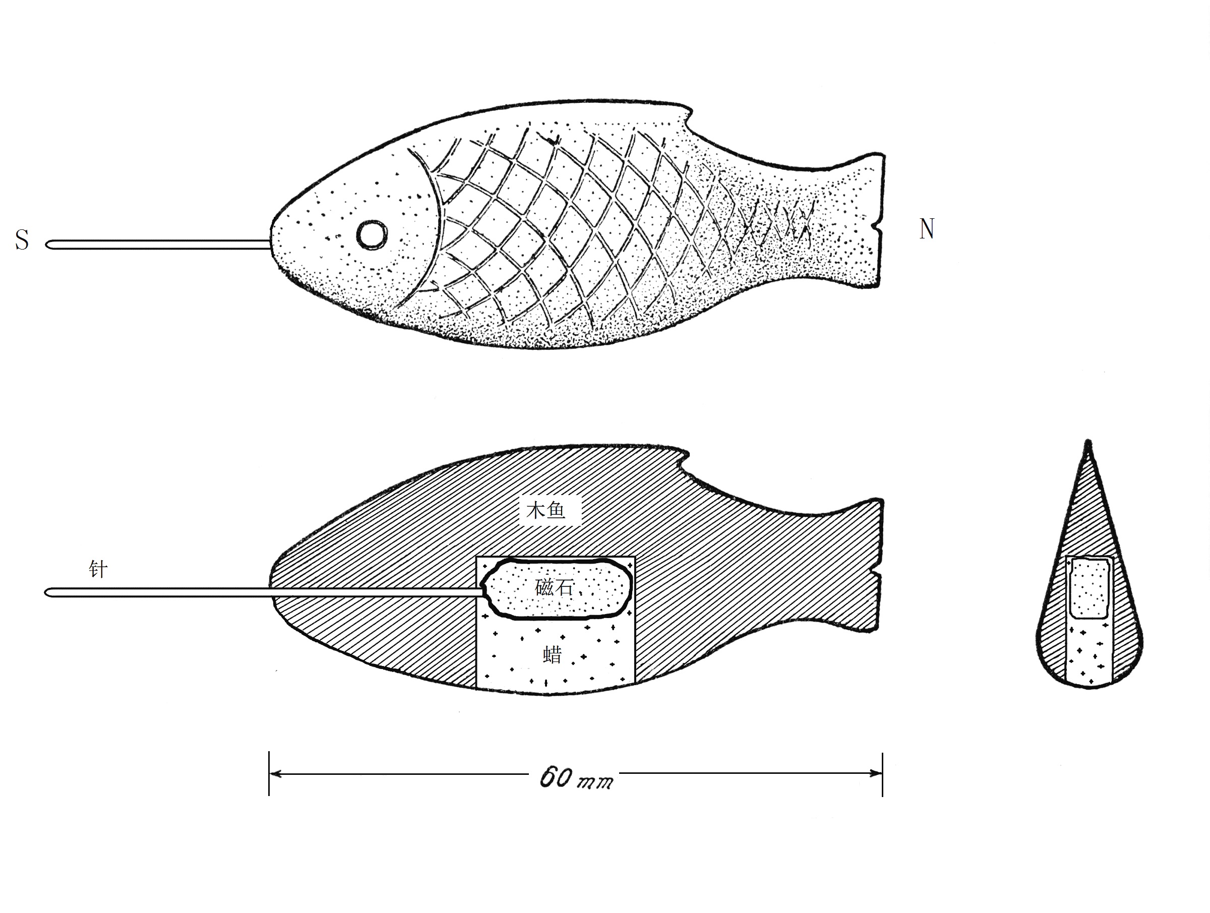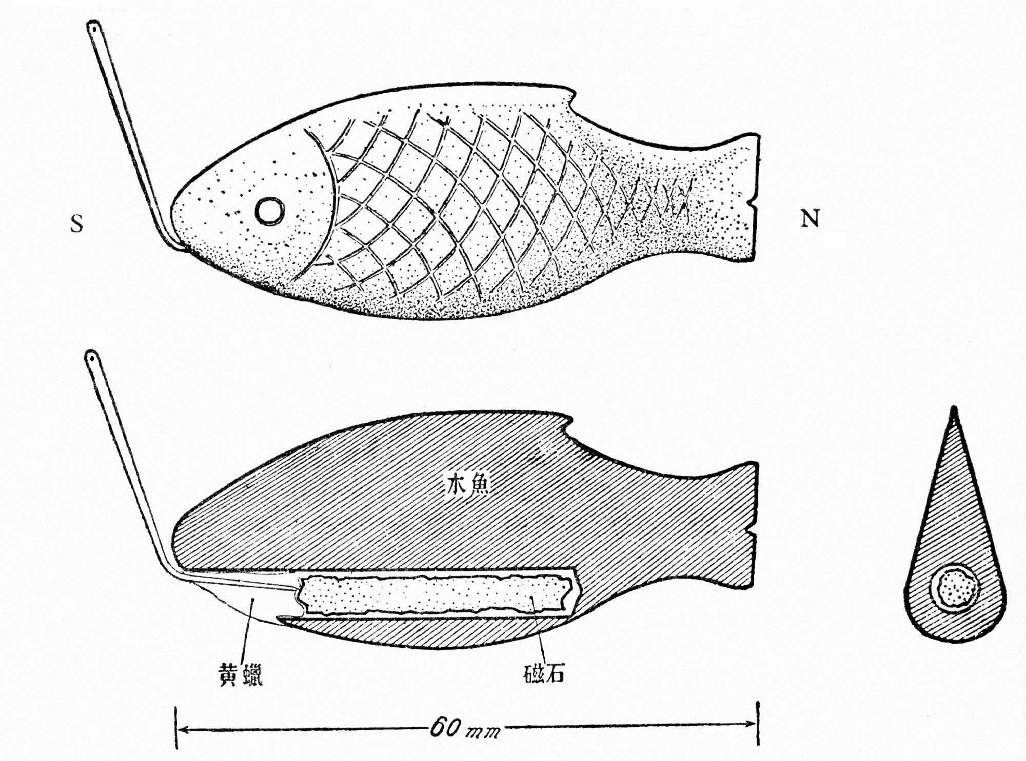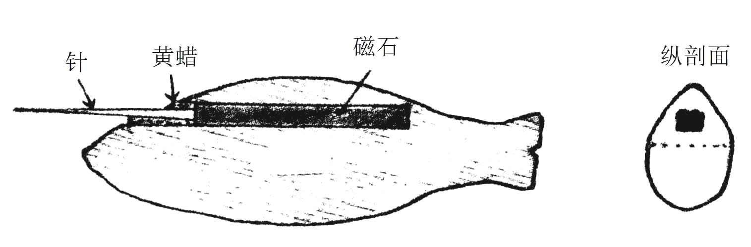 “以木刻魚子一個,如母指大,開腹一竅,陷好磁石一塊子,卻以臈填滿。用針一半僉從魚子口中鉤入,令沒放水中,自然指南。以手撥轉(zhuǎn),又復如初。”[45]