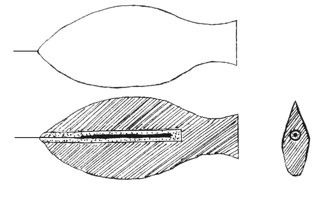 20世紀40年代王振鐸對《事林廣記》指南魚作了開創(chuàng)性的研究,他的復原圖(圖1)[11], p.154傳播甚廣。有些學者曾嘗試改進王振鐸的指南魚復原圖,參見潘吉星《指南針源流考》(圖2),[47]戴念祖《指南針》(圖3)。[14]上述三家均將磁石“一塊子”誤解為一條磁石細棒。又原文是魚腹開一孔, 陷好磁石一塊,魚口插針,而王圖、潘圖、戴圖均只開一孔。雖然上述三圖中孔的位置上下不同, 但都將針、石從同一孔中進入,不合原文記載?!吨袊茖W技術(shù)史》(物理學卷)說:在魚頭插入一根鋼針,“這是方便觀察其指向和‘以手撥轉(zhuǎn)’之用”。[48]不無道理, 但沒有說到點子上。
