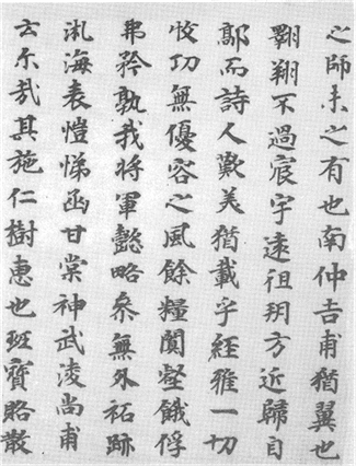 南仲??(吉)甫猶翼也,??(翱)翔不過宸宇。遠(yuǎn)徂??(朔)方,近歸自鄗,而詩人歎美,猶載乎經(jīng)雅。一切收功,無優(yōu)容之風(fēng)。餘糧闐壑,餓俘弗矜。孰我將軍,懿略?(參)無外,祏(拓)跡?海表。愷悌函甘棠,神武淩尚甫(父)云尓(爾)哉。[2]