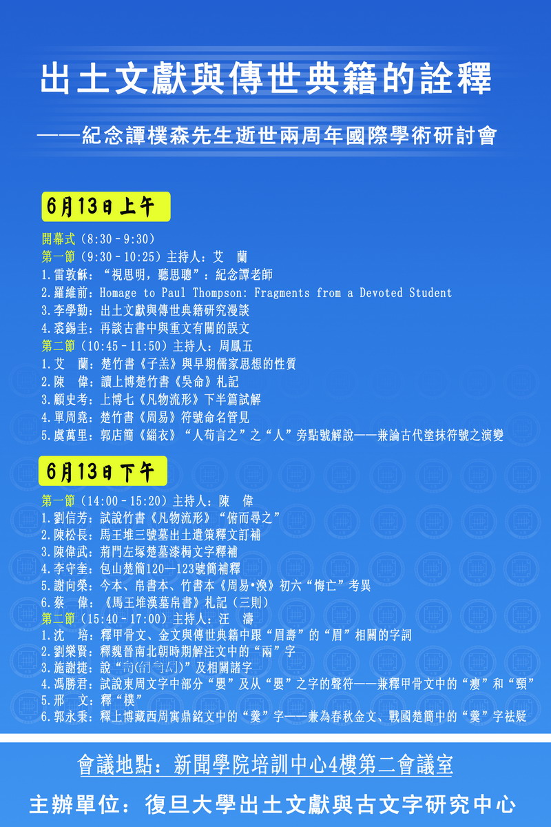 “出土文獻(xiàn)與傳世典籍的詮釋——紀(jì)念譚樸森先生逝世兩周年國(guó)際學(xué)術(shù)研討會(huì)”將於2009年6月13日至14日在復(fù)旦大學(xué)舉行?,F(xiàn)將會(huì)議日程通報(bào)如下: