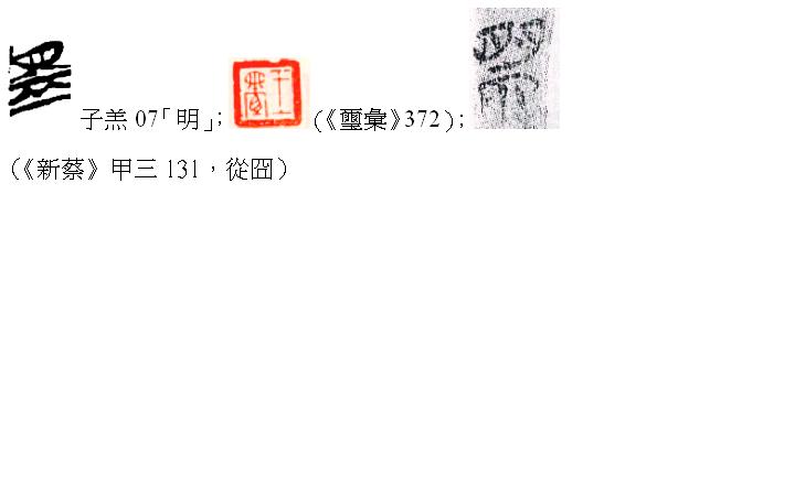 附帶一提,《璽彙》372的「盟」或以為從「目」。不過(guò)此字形與《子羔》07的「盟(明)」上部同形。而《子羔》07是由類似《新蔡》甲三131從「囧」的「盟」字演變而來(lái),則《璽彙》372似應(yīng)理解為從「囧」。