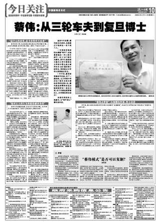 從三輪車夫到名校博士,如此大的落差,使得蔡偉成為媒體追逐的焦點(diǎn)。在他的老家遼寧錦州,人們開始用他的例子來鼓舞高考落榜少年。