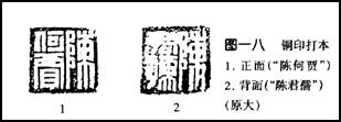 江蘇省盱眙縣東部的馬壩鎮(zhèn)東陽(yáng)村有秦漢東陽(yáng)縣城遺址,有東西兩城,共 1.5平方公里。[1]1990年?yáng)|陽(yáng)城西北小雲(yún)山西一號(hào)漢墓出土漆器上朱書(shū)有“壽萬(wàn)歲、宛樂(lè)未央、人符(富)貴”、“巨田萬(wàn)歲”、“東陽(yáng)廬里巨田侯外家”等,又出土有一方銅印,雙面陰文,正面是“陳何賈”,背面是“陳君孺”(如下圖)。發(fā)掘報(bào)告認(rèn)爲(wèi)該墓年代不晚于西漢中期,墓內(nèi)沒(méi)有五銖錢(qián),年代似在武帝劉徹元狩五年(前 118年)之前。巨田侯,史書(shū)無(wú)載,報(bào)告認(rèn)爲(wèi)和陳嬰有關(guān),《漢書(shū)·項(xiàng)羽本紀(jì)》:“項(xiàng)梁乃以八千人渡江而西。聞陳嬰已下東陽(yáng),使使欲與連和俱西。陳嬰者,故東陽(yáng)令史,居縣中,素信謹(jǐn),稱爲(wèi)長(zhǎng)者。東陽(yáng)少年殺其令,……遂強(qiáng)立嬰爲(wèi)長(zhǎng),縣中從者得二萬(wàn)人。少年欲立嬰便爲(wèi)王,異軍蒼頭特起?!谑切\(zhòng)從其言,以兵屬項(xiàng)梁。項(xiàng)梁渡淮,黥布、蒲將軍亦以兵屬焉。凡六七萬(wàn)人,軍下邳。”據(jù)《史記·高祖功臣侯者年表》,漢高祖劉邦六年十二月甲申封陳嬰爲(wèi)堂邑侯,第二代恭侯祿,第三代夷侯午,第四代季須“侯須坐母長(zhǎng)公主卒,未除服奸,兄弟爭(zhēng)財(cái),當(dāng)死,自殺,國(guó)除?!?/SPAN>堂邑縣治今南京市六合區(qū),離東陽(yáng)城不遠(yuǎn)。陳嬰家族封侯 86年(前201—116年),所以該墓可能和陳嬰有關(guān)。[2]