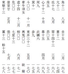 角十二,亢十二,[八月]。氐十七,房五,九月。心十十二,尾九,箕十一,十月。[斗□□[5],牽?!酢酰毰酢?A title="" href="#_edn6" name=_ednref6>[6],十一月[7]]。虛十四,[?!酢?,十二月。[8]]營室[9]廿,東壁[10]十三,正月。[圭(奎)[11]]十五,婁十二,二月。胃十四十三,[昴十[12]]五,三月。畢十五,此觽六,四月。參九, [東井[13]]三十二,[輿鬼□□[14]],五月。[柳□□[15]],七星十三,六月。張□□,翼十三,軫十五,七月。