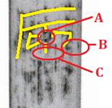 A:此處中空,豎筆不連貫 B:右旁多出的橫筆無法解釋 C:不見“大”的雙腳“人”形 |