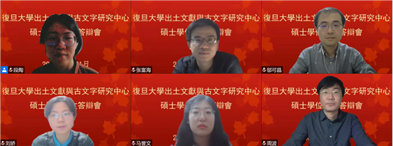 馬譽(yù)文的碩士論文題目爲(wèi)《新派上古音構(gòu)擬中利用古文字材料情況的綜合研究》,導(dǎo)師爲(wèi)張富海副教授。答辯委員會(huì)由復(fù)旦大學(xué)出土文獻(xiàn)與古文字研究中心鄔可晶副研究員、周波教授組成、劉嬌副研究員。鄔可晶副研究員擔(dān)任答辯主席,段陶博士擔(dān)任答辯秘書(shū)。